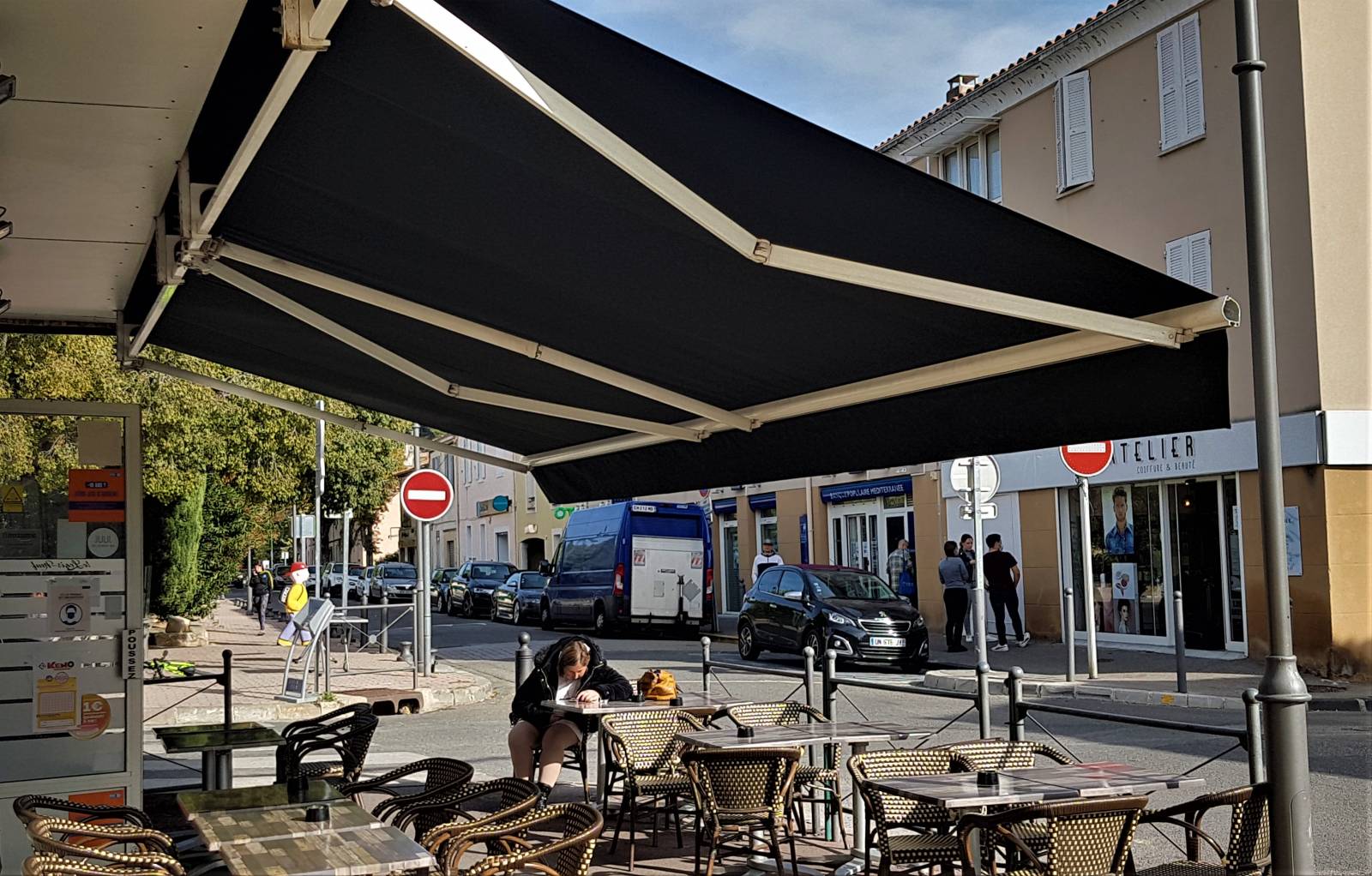 Notre client souhaitait que son store soit utilisé également comme un outil commercial. C'est pourquoi nous avons fait floquer la toile pour que celle-ci indique le nom de l'établissement et les logos de ses partenaires. Alors si vous souhaitez vous aussi garder l'armature de votre banne tout en changeant sa toile (et faire ainsi des économies), et que vous vous situez prés d'Aubagne, n'hésitez pas à contacter l'un des leaders du store extérieur prés de chez vous : la société Alberstore.