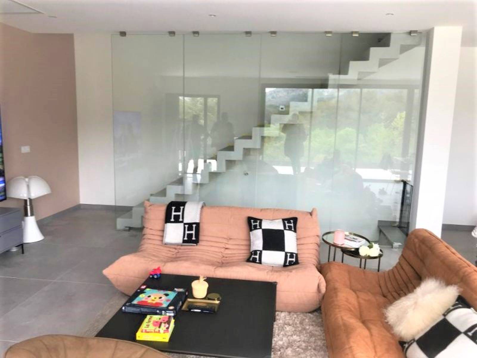 La société Alberstore à Aubagne a créé, vendu et posé ce mur de verre le long d'un escalier suspendu d'une maison contemporaine à Marignanne. Les parois transparentes servent de garde-corps en extrémité des marches tout en conservant le style moderne et épuré du séjour. Notre client a ainsi pu allier sécurité et esprit design grâce à ce parapet invisible. Le garde-corps vitré est composé de plusieurs verres clairs type 88² trempé à joints polis. Chaque vitrage est fixé en partie haute et basse par 4 pince-verres rectangulaires en inox. Toutes les normes de sécurité européeennes ont bien évidemment été respectées pour la conception de ce garde-corps composé de verre et d'inox. Alors si habitez prés d'Aubagne (périmère de 50 km) et que vous souhaitez vous aussi faire installer un garde-corps tout verre le long d'un escalier existant ou lors de la construction d'une maison neuve, n'hésitez-pas à contacter le spécialiste du garde-corps sur mesure vitré dans votre région. Un de nos technico-commerciaux se déplacera gratuitement chez vous afin de vous conseiller et de vous établir un devis.