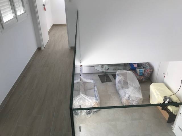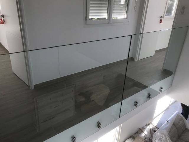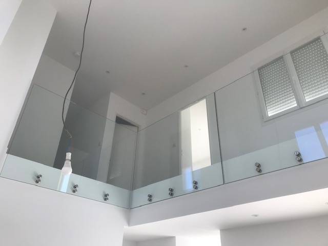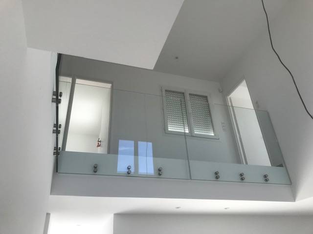 La société Alberstore à Aubagne a conçu, vendu et posé un garde-corps de palier et d'escalier en verre dans une maison neuve de Marseille. La rembarde protège un vide sur séjour et une descente d'escalier. Les verres de ce garde-fou, ont été fixés à l'anglaise aussi bien pour la trémie que le long des marches de l'escalier. Ce garde-corps est donc composé de vitrages type 88² feuilleté et trempé (verre Securit à joints polis tout le tour) mais aussi d'entretoises inox de fome ronde (pinces verres) qui fixent les verres sur le côté. La transparence du verre et l'inox des fixations apportent un aspect design, moderne et épuré au séjour de la villa contemporaine de notre client. Ces parois vitrées ont été conçues dans le respect des normes européennes de sécurité. Alors si vous souhaitez créer une rembarde ou remplacer un garde-corps ancien et que vous habitez sur un périmètre de 50 km autour d'Aubagne, n'hésitez-pas à contacter la société Alberstore. Les devis avec conseils techniques sont gratuits.