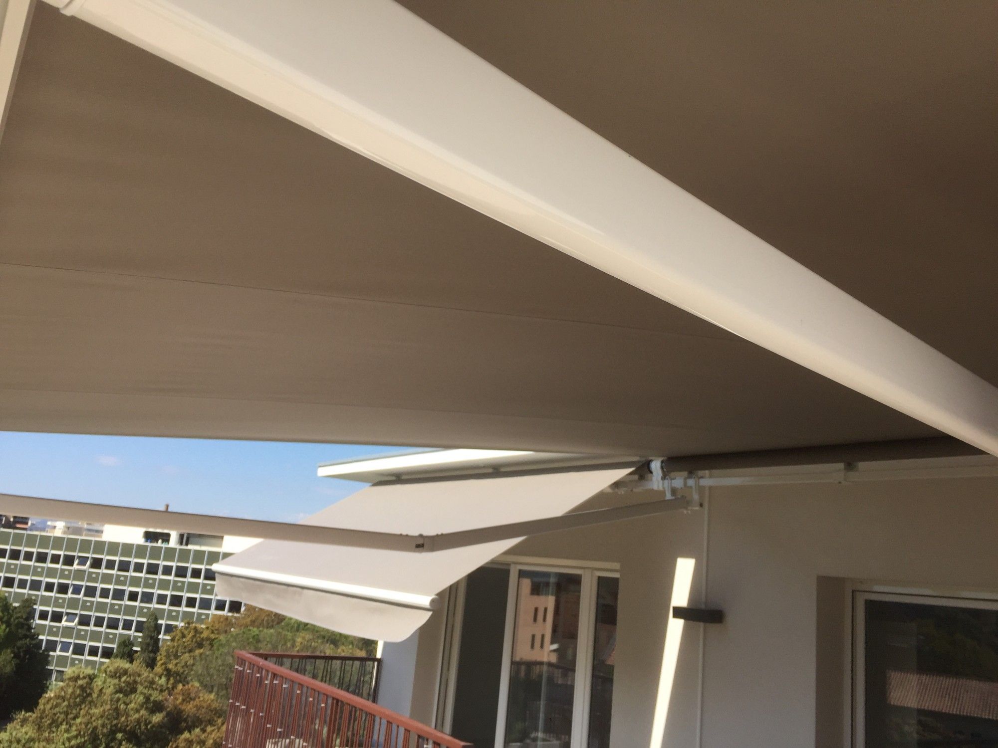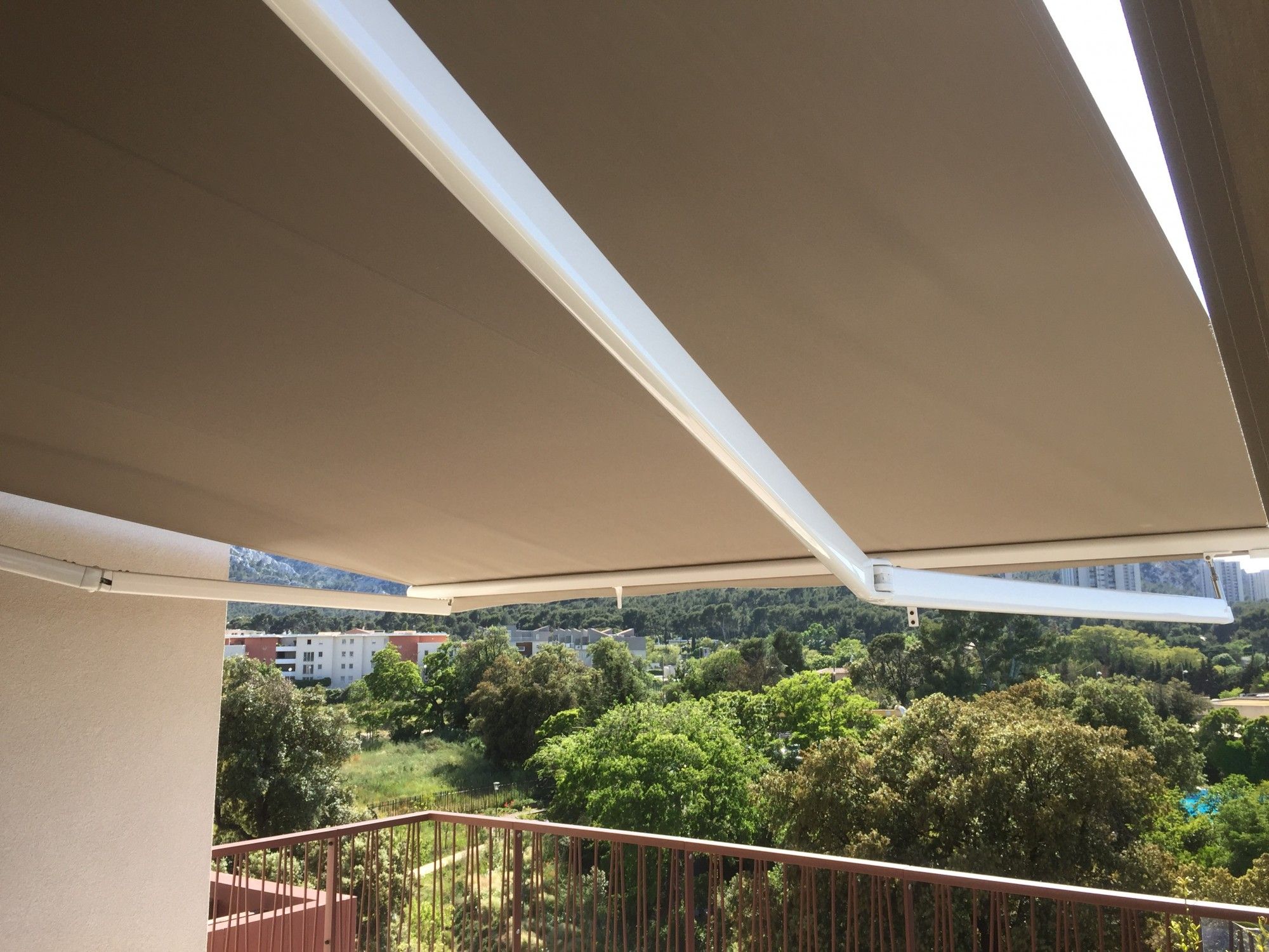 La société Alberstore à Aubagne a fourni et posé 2 stores monoblocs sur la terrasse d'un appartement à Marseille. Ces stores bannes ont été fixés en plafond. L'un des stores extérieurs est équipé de bras croisés (bras croisés lorsque l'avancée du store est plus importante que sa largeur). L'armature aluminium des stores est laquée en blanc (RAL 9010). La toile des stores bannes correspond à la référence Dickson Orchestra 7559 uni taupe. Les stores monoblocs se manoeuvrent grâce à des moteurs tubulaires type radio et à des télécommandes de marque Somfy.