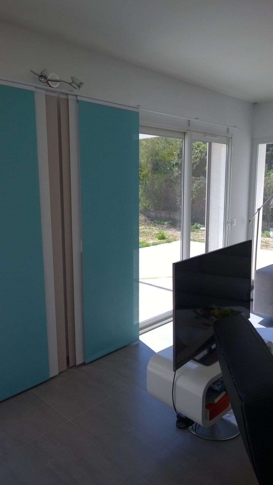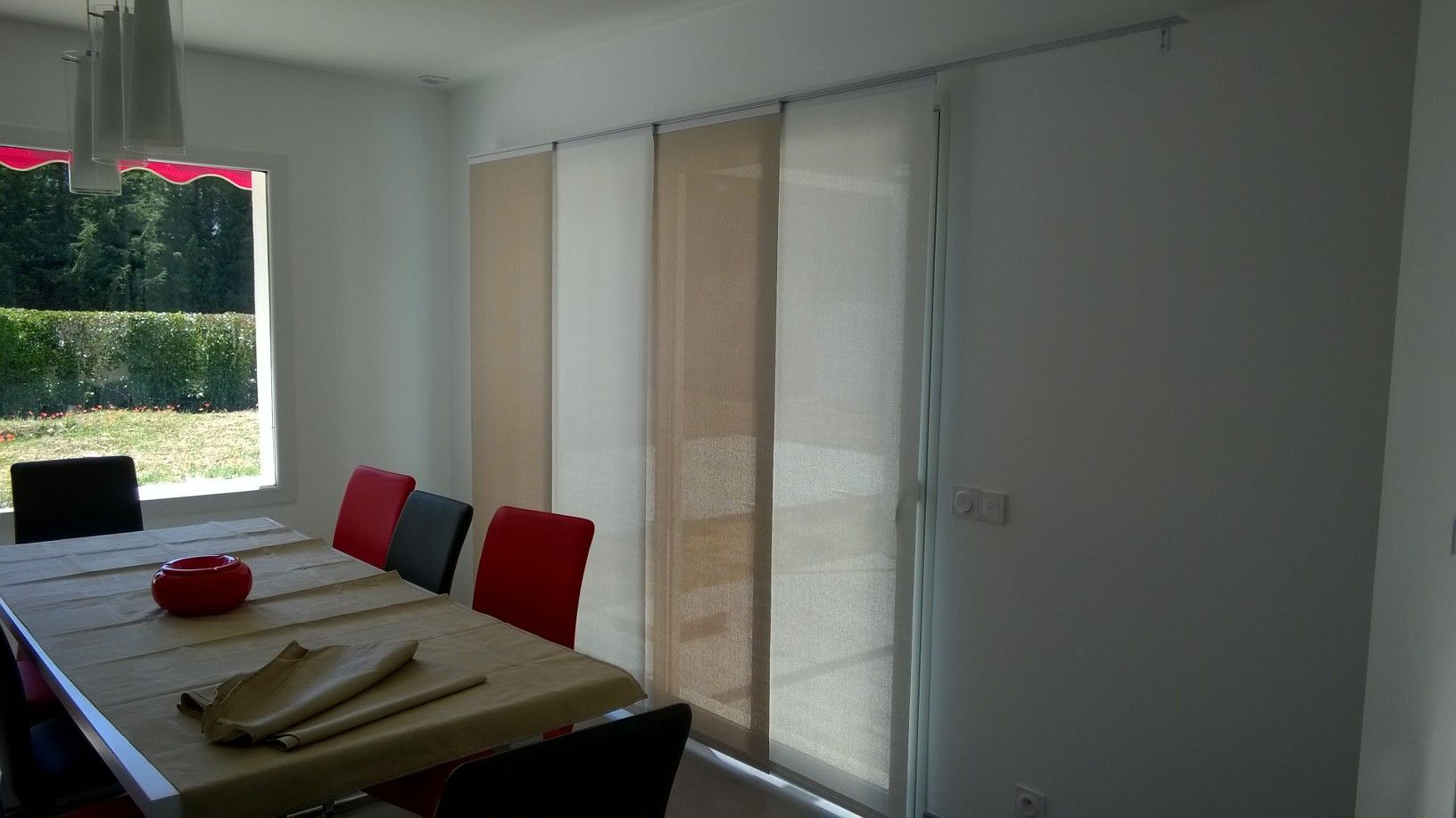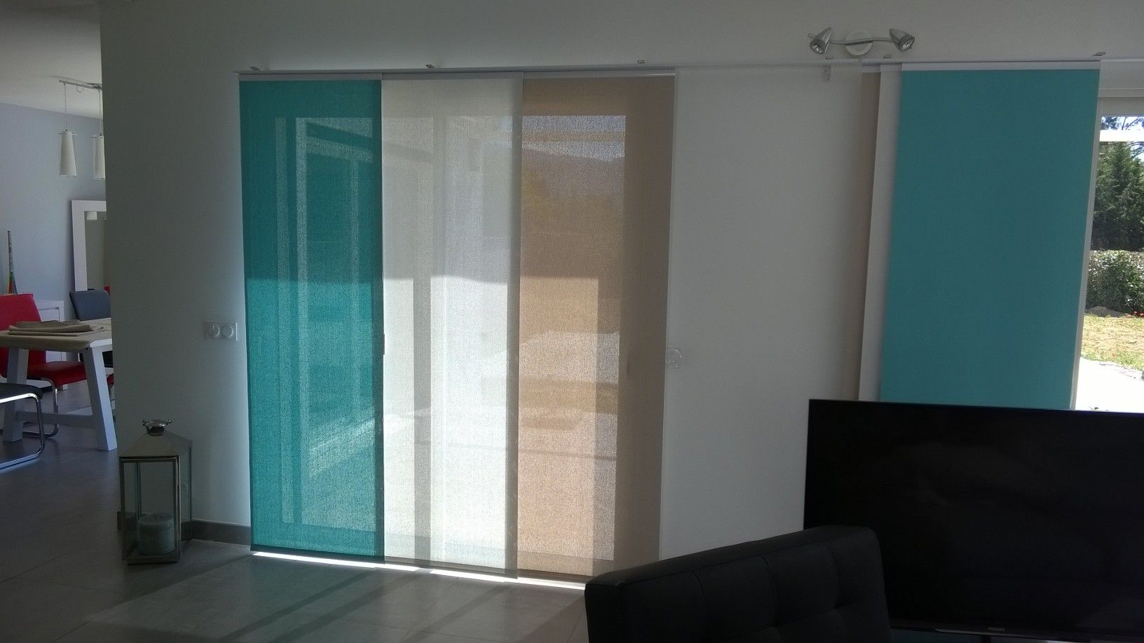La société Alberstore à Aubagne a posé chez un des ses clients à Marseille plusieurs stores type "panneau japonais". Idéales pour la séparation de pièces ou ici l'occultation de grandes baies vitrées, les cloisons japonaises s'intègrent parfaitement à la décoraton contemporaine de notre client. Grâce au débord de rail, les cloisons peuvent être déportées totalement sur un côté pour un dégagement total de la baie. Les panneaux présentés sur les photos, sont confectionnés en tissu type Soltis 99 de marque Ferrari. Les toiles type Soltis 99 permettent de filtrer la lumière grâce à leur microperforation tout en isolant de la chaleur. De nombreux choix de tissus (voilage, screen, occultant...) sont possibles. N'hésitez pas à nous contacter pour des stores type paroi japonaise sur mesure, les devis sont gratuits.