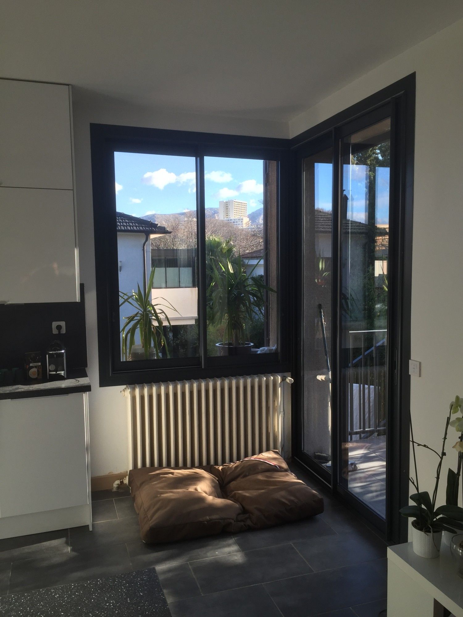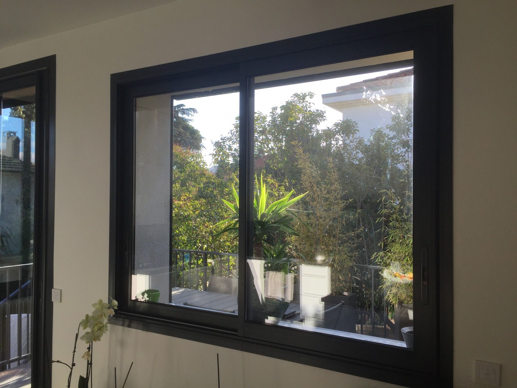 La société Alberstore à Aubagne a posé des fenêtres de rénovation aluminium dans le séjour de son client de Marseille. Comme on peut le voir sur les photos, la société Alberstore a installé 3 châssis coulissants 2 vantaux ainsi qu'une fenêtre type ouvrant à la française 2 vantaux avec une imposte fixe. La finesse du profilé de l'aluminium et la couleur référence Metallic noir N2100 du laquage apportent un aspect design et moderne à la pièce. Le double-vitrage type 4/20/4 ITR FEA gaz argon et la rupture de pont thermique des châssis assurent une très bonne isolation phonique et thermique. Les fenêres aluminium ont été fabriquées sur mesure à Marseille (fabrication française). Notre client a d'ailleurs pu bénéficier d'un crédit d'impôts suite à la pose de ces fenêtres isolantes et d'un taux de TVA réduit. La société Alberstore possede le label Qualibat-RGE (nécessaire pour le crédit d'impôts) qui est un gage de sérieux et de professionnalisme.