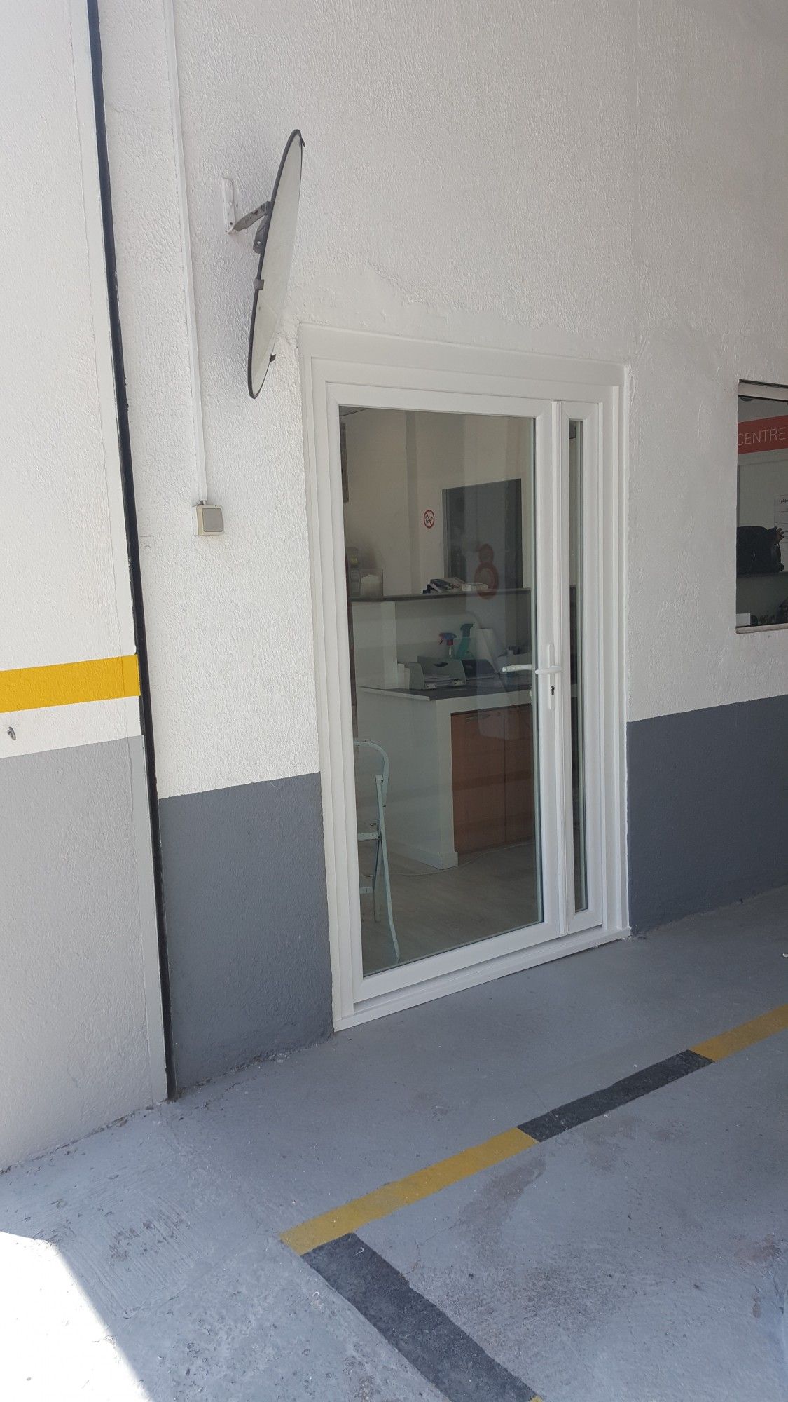 Ici la société Alberstore à Aubagne a posé deux ensembles en PVC chez un garagiste de Marseille. Ces deux porte-fenêtres en PVC blanc ont été fabriquées sur mesure en France. Sur la photo numéro 1, on peut voir un châssis PVC ouvrant à la française 2 vantaux (vantaux de tailles inégales) surmonté d'une imposte fixe (châssis fixe en hauteur). Sur la photo numéro 2, on aperçoit une deuxième porte fenêtre PVC 2 vantaux (à vantaux également de tailles inégales, ouvrant principale à droite vue intérieure) à double béquille et serrure à clés. Ces deux portes PVC sont équipées de vitrages anti-effraction type 44.2/12/04.