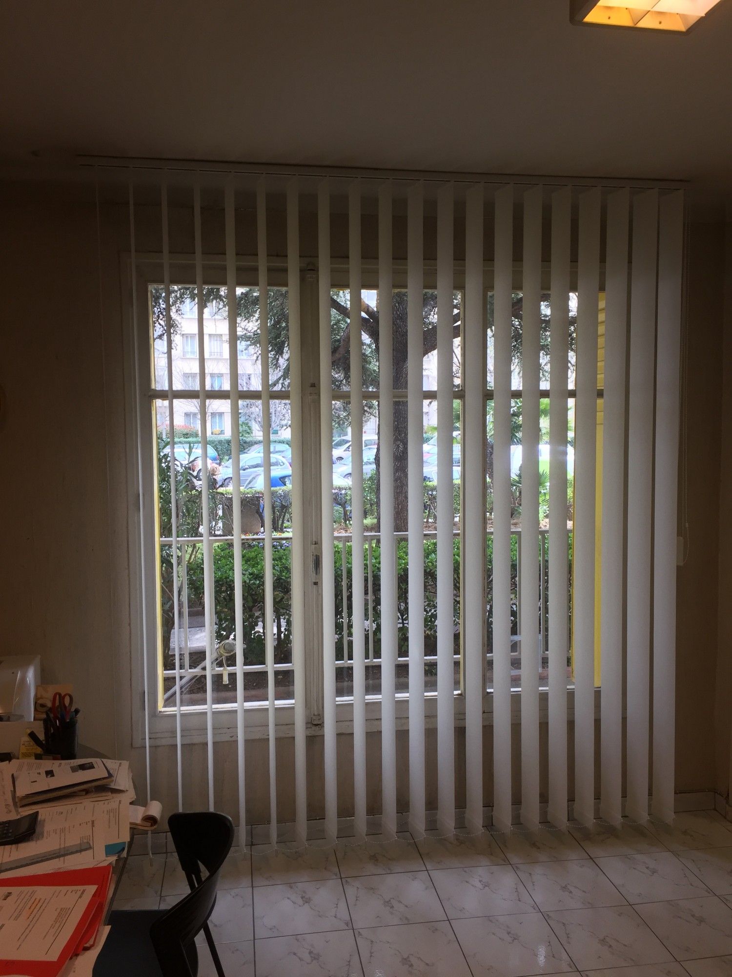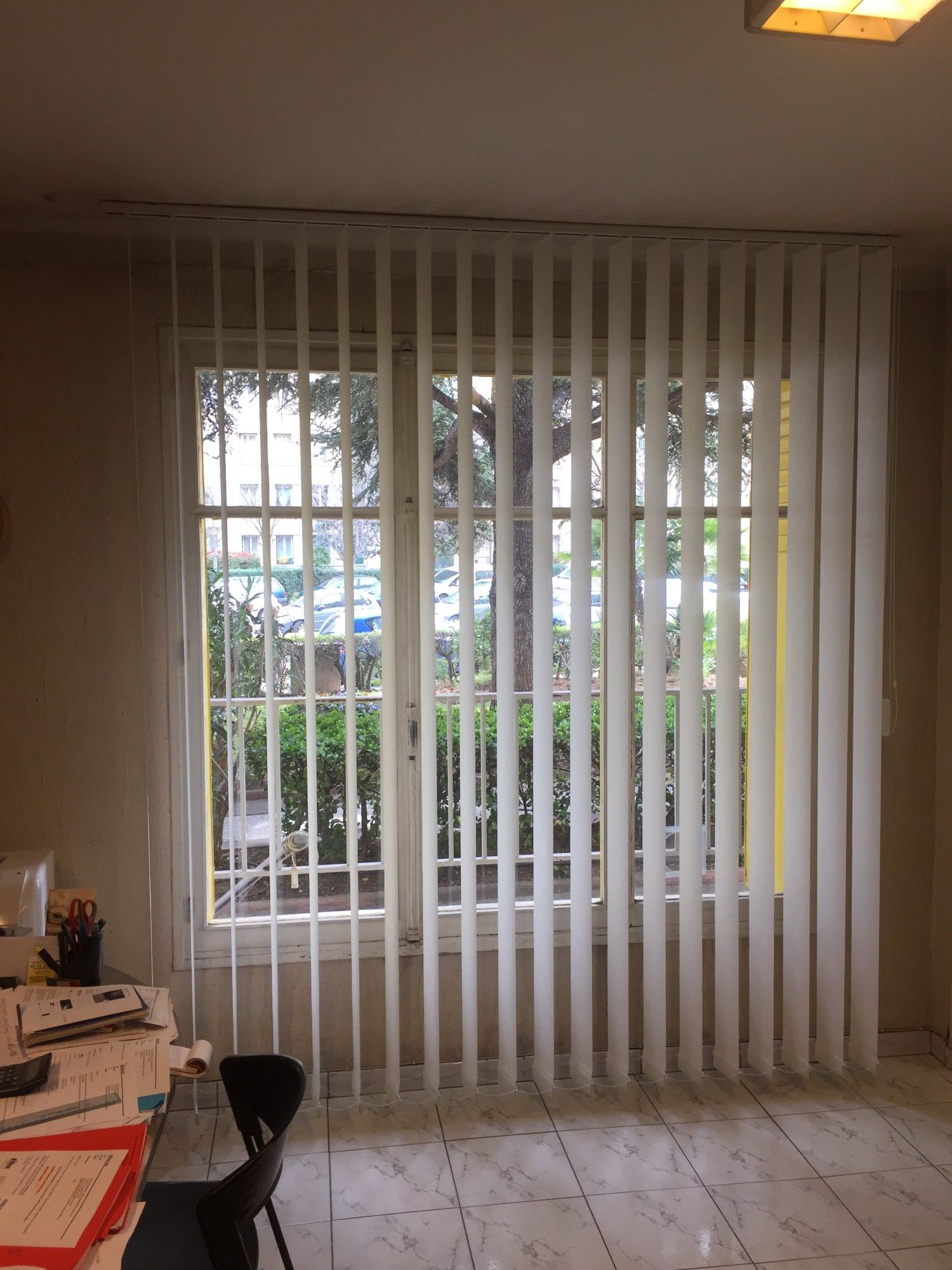 La société Alberstore à Aubagne a posé plusieurs stores à bandes vertcales devant des fenêtres d'une société du 9ème arrondissement de Marseille. Ces stores d'intérieur type Californien se manoeuvrent aisément par cordon et chaînette et permettent ainsi à notre client de décider précisément du degré d'entrée de lumière. Les bandes verticales de 127 mm ont été confectionnées avec un tissus type screen 8505 microperforé en fibre de verre et PVC. Les stores californiens ont été posés en plafond.
