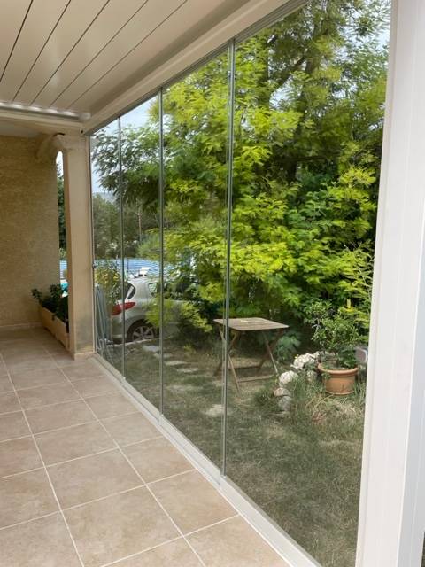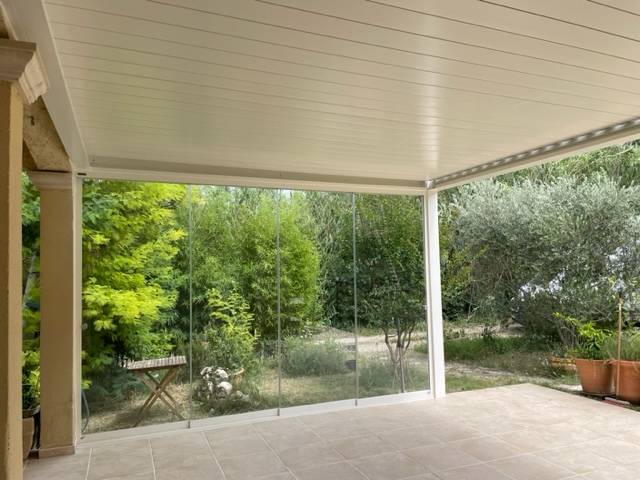 Pour aller plus loin dans le confort, il est possible d’ajouter des rideaux de verre afin de fermer l’espace, tout en conservant une luminosité naturelle et une vue dégagée sur l’extérieur.