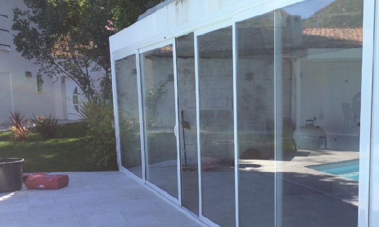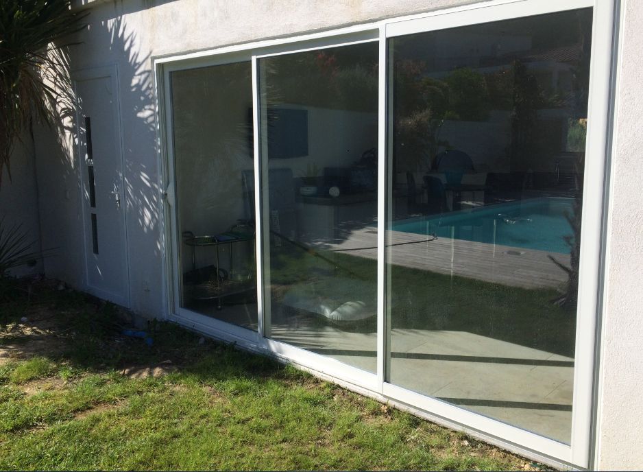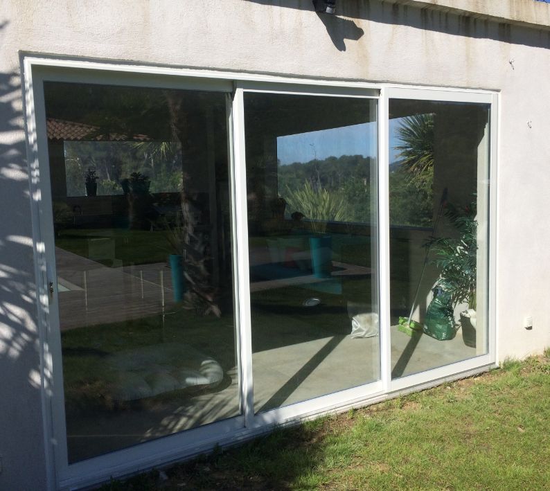 A Carnoux en Provence, La société Alberstore Aubagne a posé récemment deux châssis coulissants à 3 et 4 vantaux en aluminium laqué blanc (RAL 9010). Le châssis coulissant 4 vantaux 2 rails propose une ouverture centrale et mesure 6,51 M de large, il représente le produit idéal pour les grandes ouvertures. Le châssis coulissant à 3 vantaux dispose d'une ouverture sur chaque côté avec poignée extèrieure à clés.