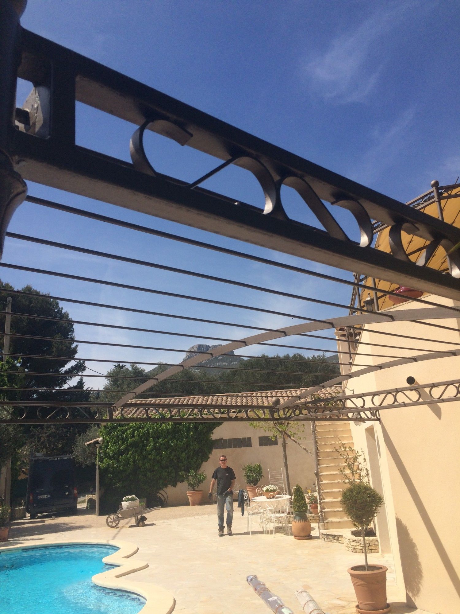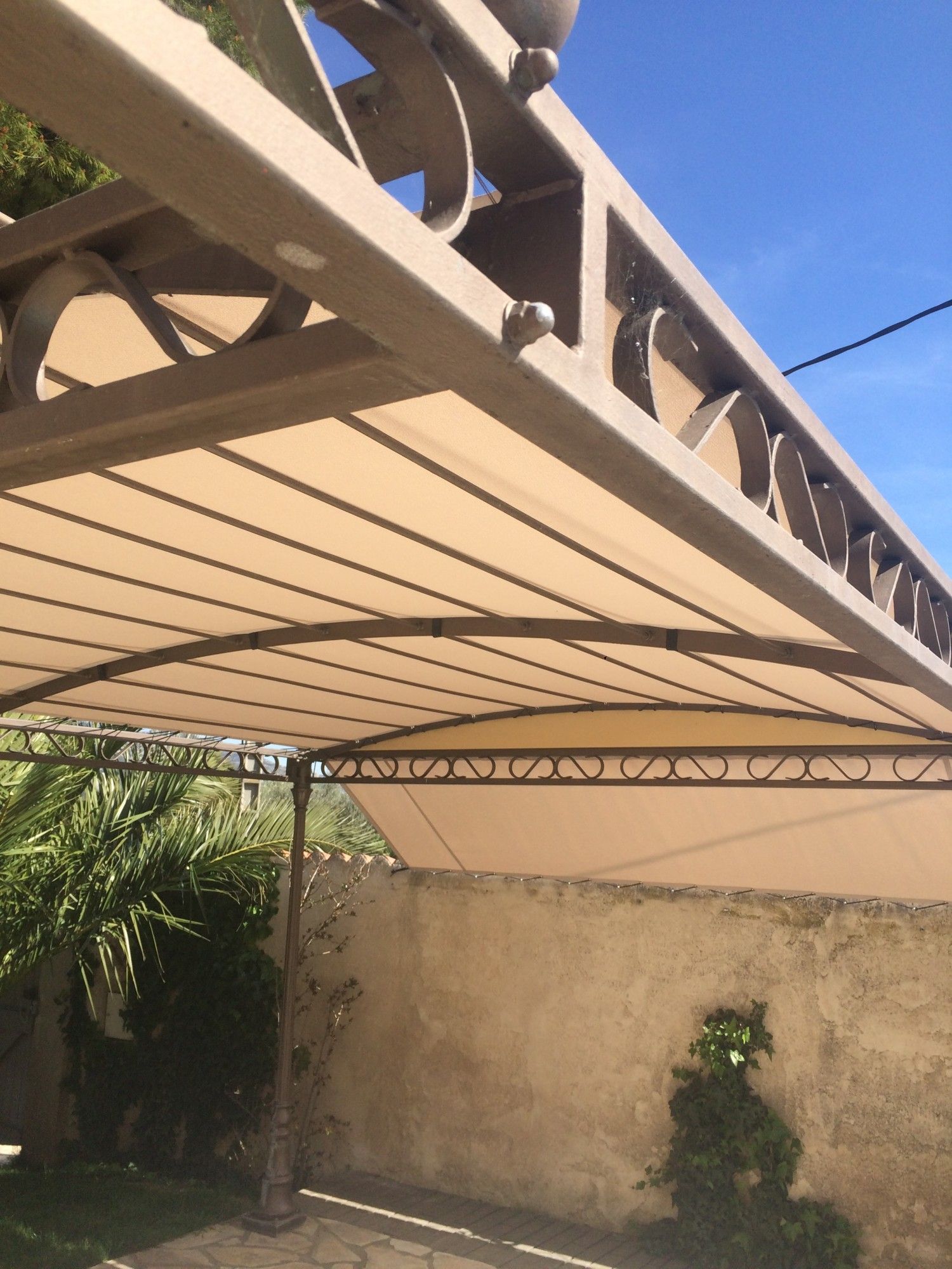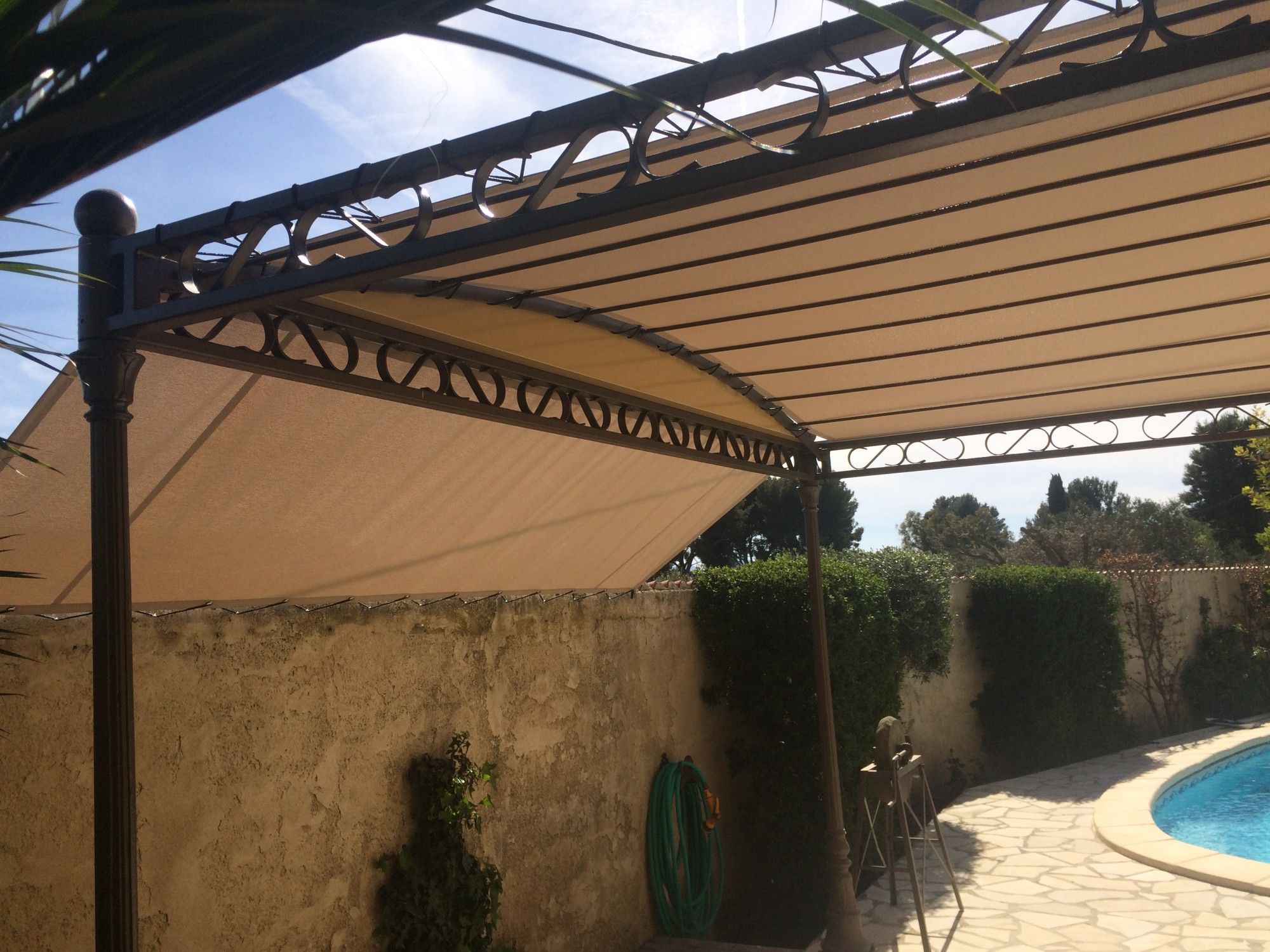 Sur ces photos, la société Alberstore à Aubagne a posé 2 toiles de pergola type Soltis 92 chez un des ses clients dans les Bouches du Rhône. Une première toile recouvre la pergola : elle est attachée par sandow sur les 4 côtés et par velcros sur les traverses. Une deuxième toile s'ajoute en extrémité afin de se protéger du soleil couchant. La toile Soltis 92 propose une protection thermique optimale tout en facilitant la circulation de l'air. La microperforation de la toile permet effectivement d'éviter un ressenti d'effet de serre. De plus la toile Soltis 92, qui est enrobée de PVC et pèse 420gr/M², se montre particulièrement résistante à la déchirure.