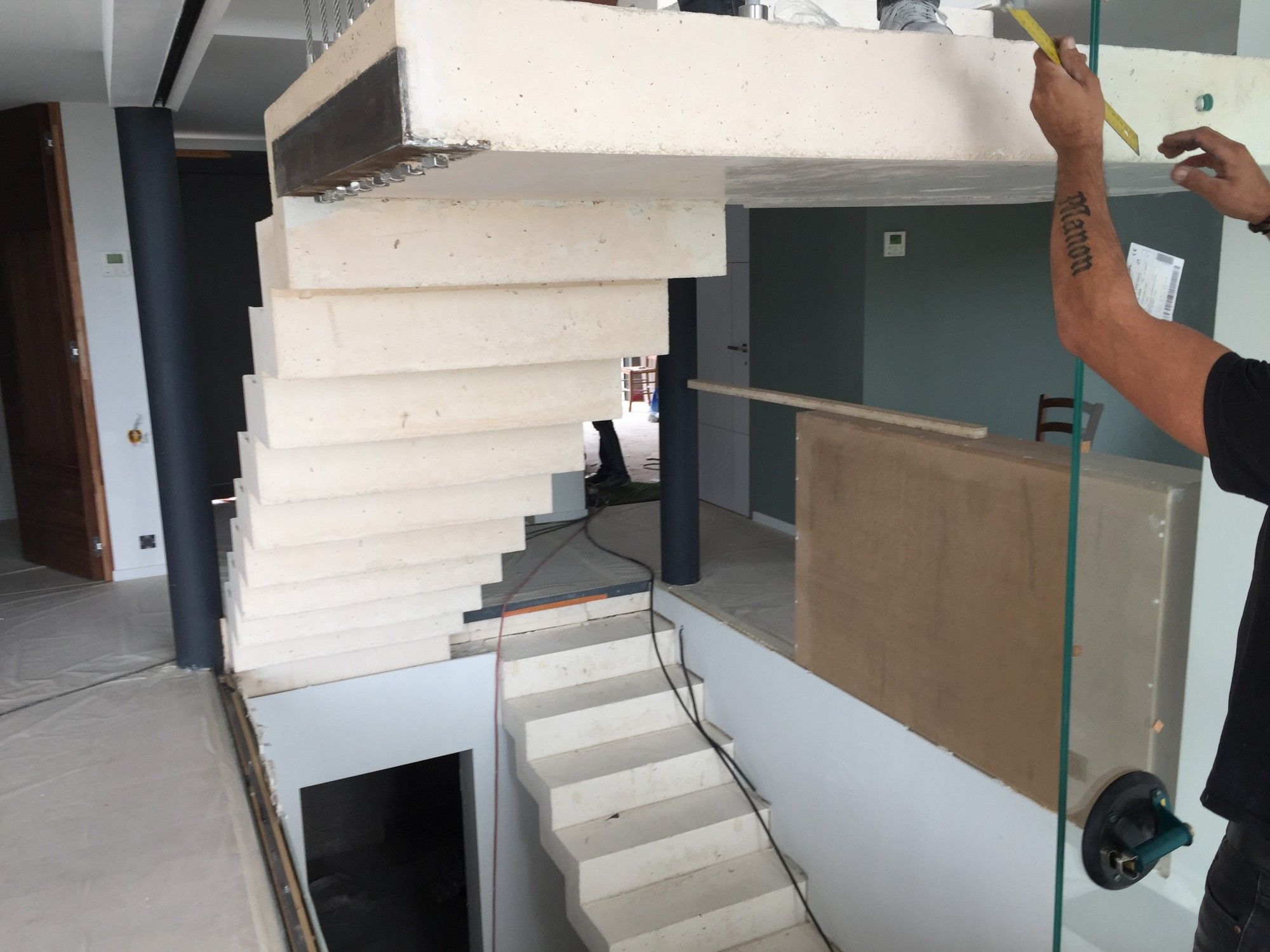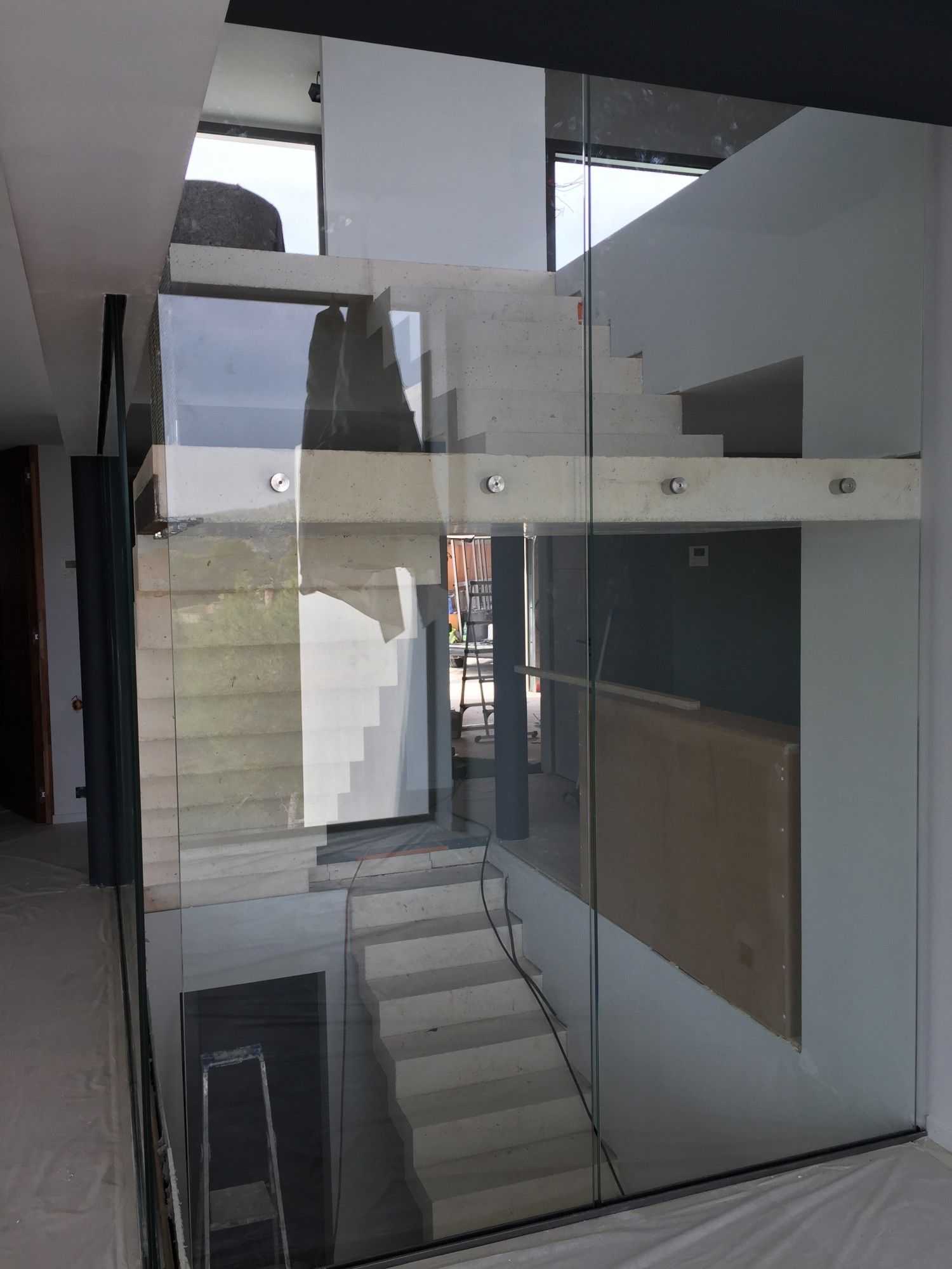 La société Alberstore à Aubagne a fourni et posé des parois de verre servant de garde-corps autour de l'escalier d'une maison neuve sur la côte bleue. Les plaques de verre correspondent à un verre feulleté type 88² clair trempé 2 faces avec joint poli tout le tour. La transparence du verre et l'esthétique des entretoises (pièces de fixation du verre) permettent de mettre en évidence le design de l'escalier tout en alliant style et sécurité. Cette cage de verre a été confectionnée sur mesure selon les souhaits de notre client.