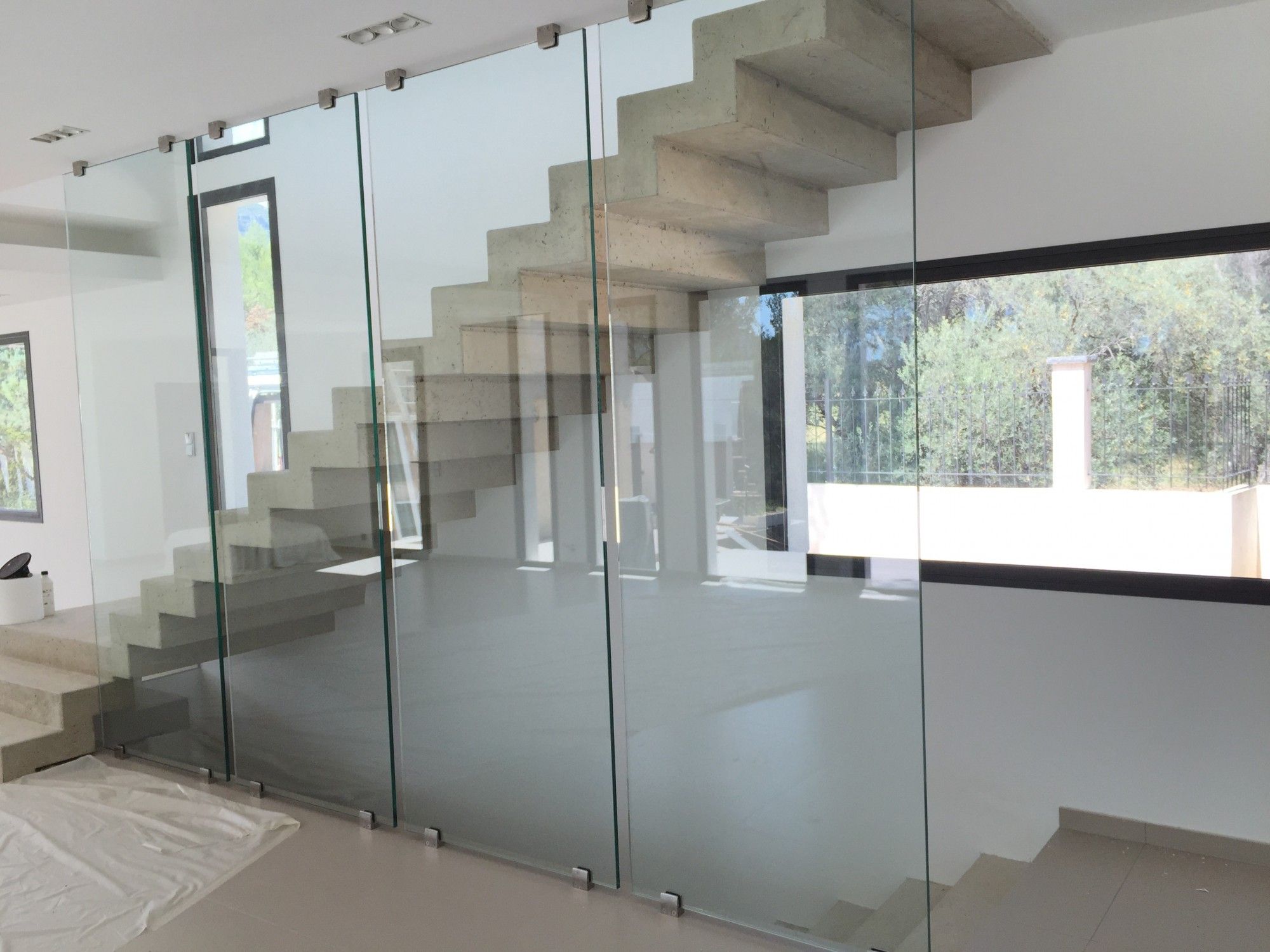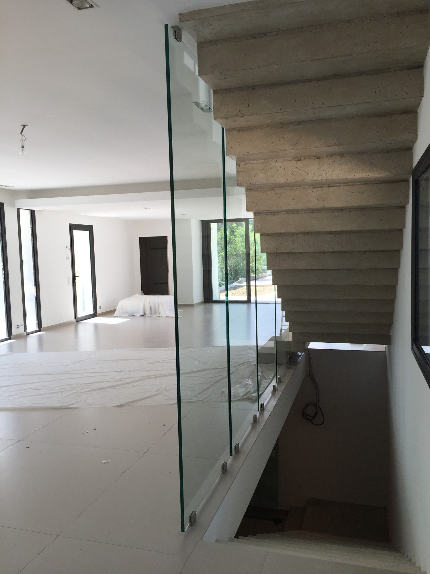 La société Alberstore à Aubagne a posé des parois de verre sur le côté d'un escalier dans une maison en construction à Marseille. La transparence du verre permet de garder l'effet flottant de l'escalier, de donner un aspect design à la maison tout en assurant une sécurité pour les personnes. Les parois vitrées sont formées de panneaux de verre type 10.10.2 clair feuilleté et de pinces en inox brossé. Si vous souhaitez vous renseigner sur les garde-coprs vitrés contactez la société Alberstore à Aubagne au 04 42 84 28 79, les devis sont gratuits.