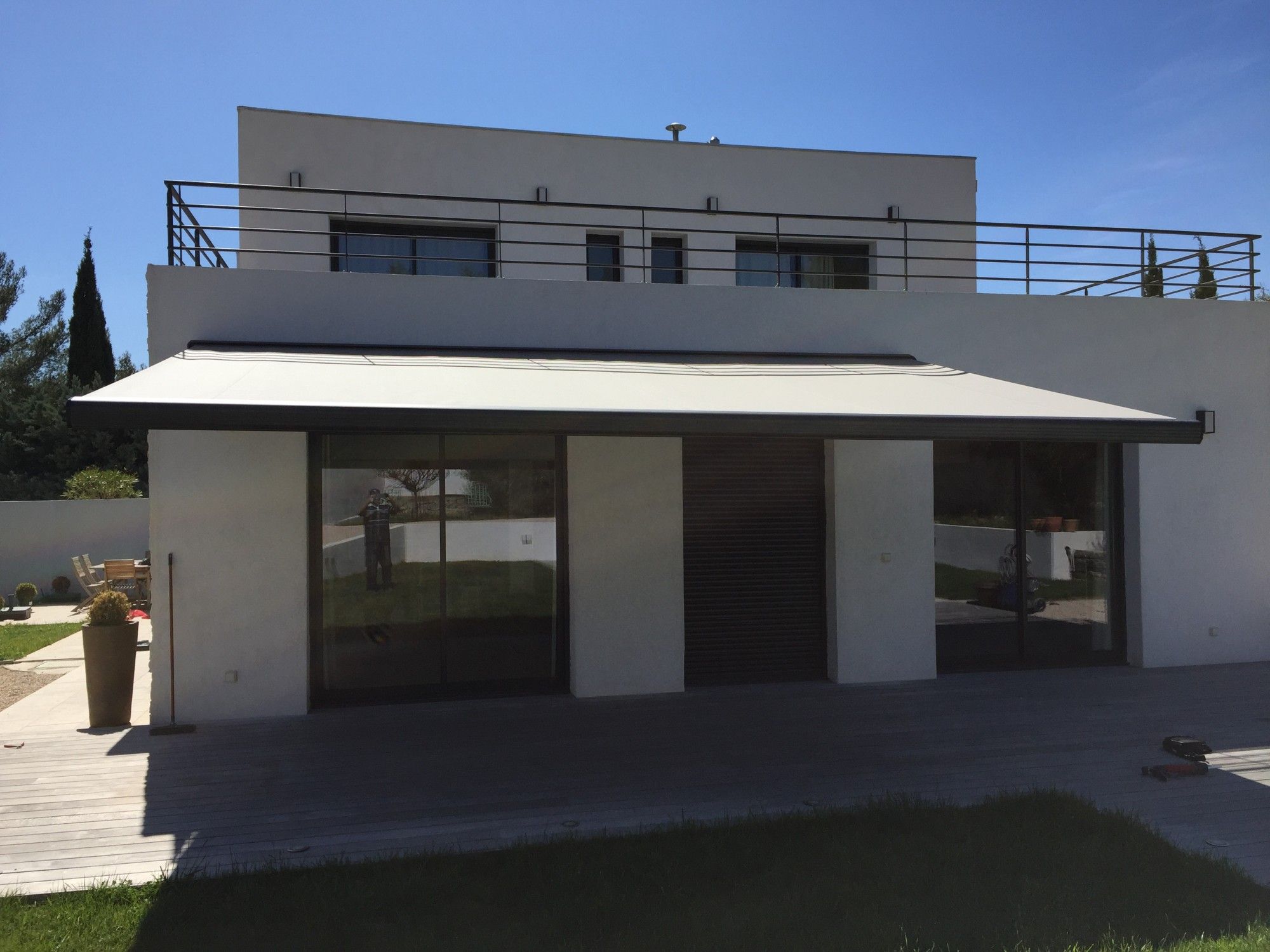 Sur les photos nous voyons des Stores extérieurs type banne à armature en aluminium laqué et à toile de la gamme Dickson. Ces stores s'intègrent parfaitement au cadre d'une maison de style contemporain grâce à leur lambrequin droit, à leur toile unie et à leur armature discrète. La société Alberstore Aubagne saura vous conseiller pour choisir le store qui s'intègrera le mieux dans votre maison qu'elle ait une architecture moderne ou traditionnelle, située à la campagne ou en centre ville......
