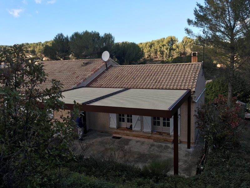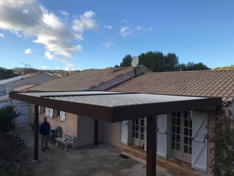 La société Alberstore à Aubagne a fourni et posé une pergola bioclimatique d'une longueur de 7 mètres et d'une profondeur de 4,7 M à Marseille (fabrication de la pergola sur mesure par la marque française Distral). Cette pergola à lames orientables est composée de 2 modules (du fait de sa grande longueur). Notre client a pu choisir parmi de nombreuses options proposées pour personnaliser sa pergola bioclimatique et intégrer la pergola au style de sa maison. Il a donc opté pour une forme de lames plates (plutôt qu'en S) et une bicoloration de la pergola : la stucture est marron alors que les lames de ce brise soleil sont beiges. Il a également choisi un éclairage de sa terrasse par spots intégrés aux lames et aux poutres du pourtour de la pergola.