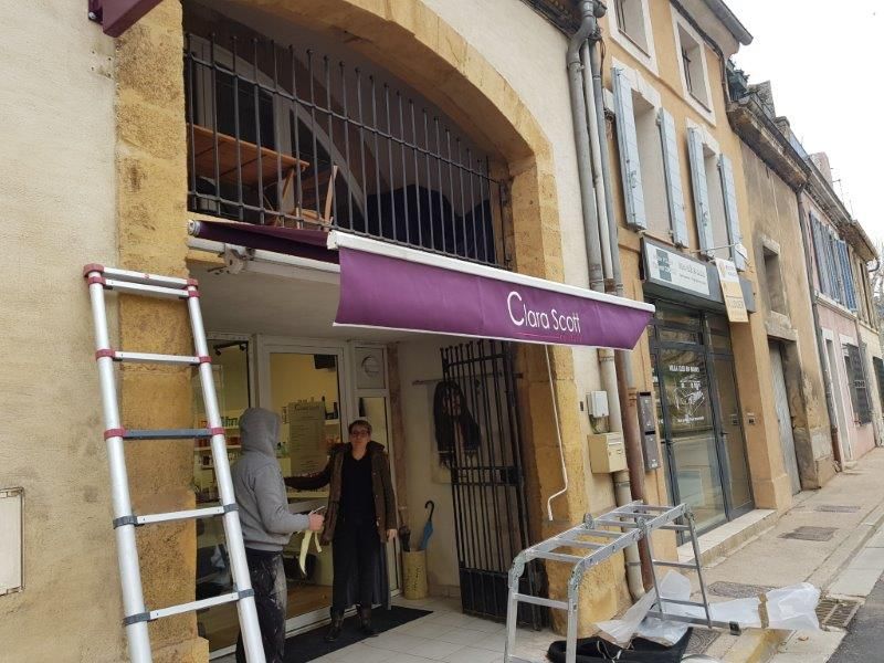 La société Alberstore à Aubagne a fourni et posé une nouvelle toile pour le coiffeur Clara Scott de Jouques dans les Bouches du Rhône. Ce commerçant a pu garder l'armature de sa banne et n'a ainsi changé que la toile. Il a opté pour une toile de store extérieur de marque Dickson (nouvelle collection Dickson Solar Fabrics) de couleur cassis. La toile acrylique du lambrequin a été floquée selon les souhaits de notre client par un peintre en lettres.