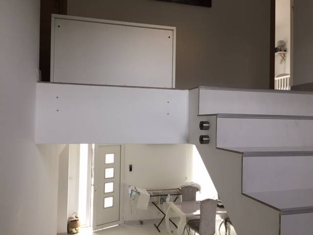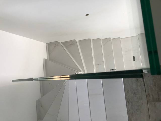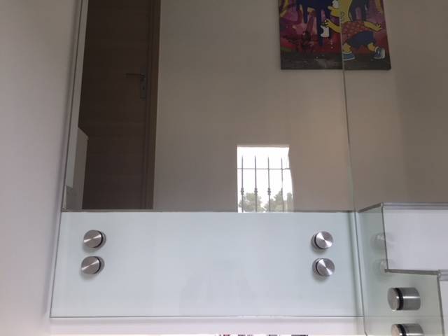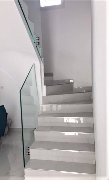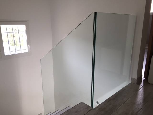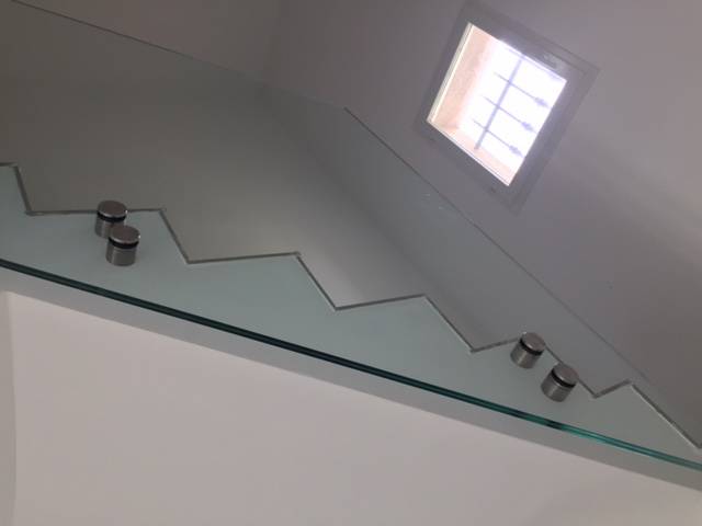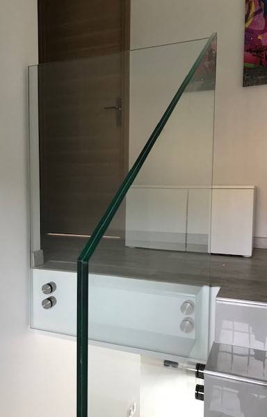 La société Alberstore à Aubagne a vendu, conçu et posé ce garde-corps en verre pour un escalier tournant d'intérieur dans une villa neuve de Marseille. Ce garde-corps est composé de vitrage Securit type 88² trempé clair. Les bords de ces rembardes vitrées ont été polis et les coins arrondis. Chaque paroi de verre du garde-corps a été percée puis fixée avec des pinces rondes en inox 316. Il s'agit donc d'une pose de garde-corps à l'anglaise par entretoises. La transparence du verre combinée à l'inox des pinces apportent un style épuré et design à la maison contemporaine de nos clients. Ce garde-fou a été fabriqué sur mesure selon les normes de sécurité imposées : hauteur du verre, fixation..... Pour tout projet de garde-corps, dans un logement neuf ou en rénovation (évacuation et remplacement d'un ancien garde-corps), n'hésitez pas à contacter la société Alberstore. Les devis avec déplacement sur chantier sont possibles et gratuits si vous habitez dans un périmètre de 50km autour d'Aubagne.