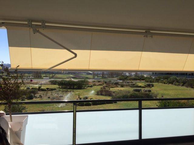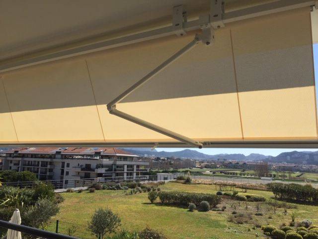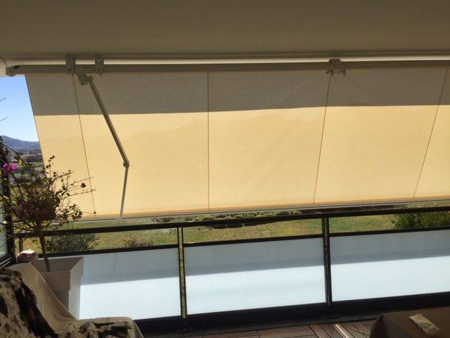 La société Alberstore à Aubagne a vendu et posé ce store extérieur monobloc sur un balcon élevé d'une résidence de Marseille. Cette banne, non coffre, a été fixée en plafond sous la terrasse du voisin du dessus et sa toile est ainsi protégée par cette dernière. Elle a été fabriquée sur mesure en France. Notre client peut manoeuvrer son store extérieur à l'aide d'une télécommande car le store est équipé d'un moteur de marque Somfy (leader dans le domaine des automatismes) à ondes radio. La toile de la banne est microperforée et correspond au modèle Soltis 96 Lounge de la marque Serge Ferrari. L'avantage d'une toile microperforée est qu'elle permet à l'air de circuler (pas d'effet de serre sous le store) mais aussi qu'elle est très résistante à la déchirure car la bâche est enrobée de PVC. Alors si vous avez également un projet de store extérieur et que vous habitez prés d'Aubagne, n'hésitez pas à contacter la société Alberstore. Les devis sont gratuits.