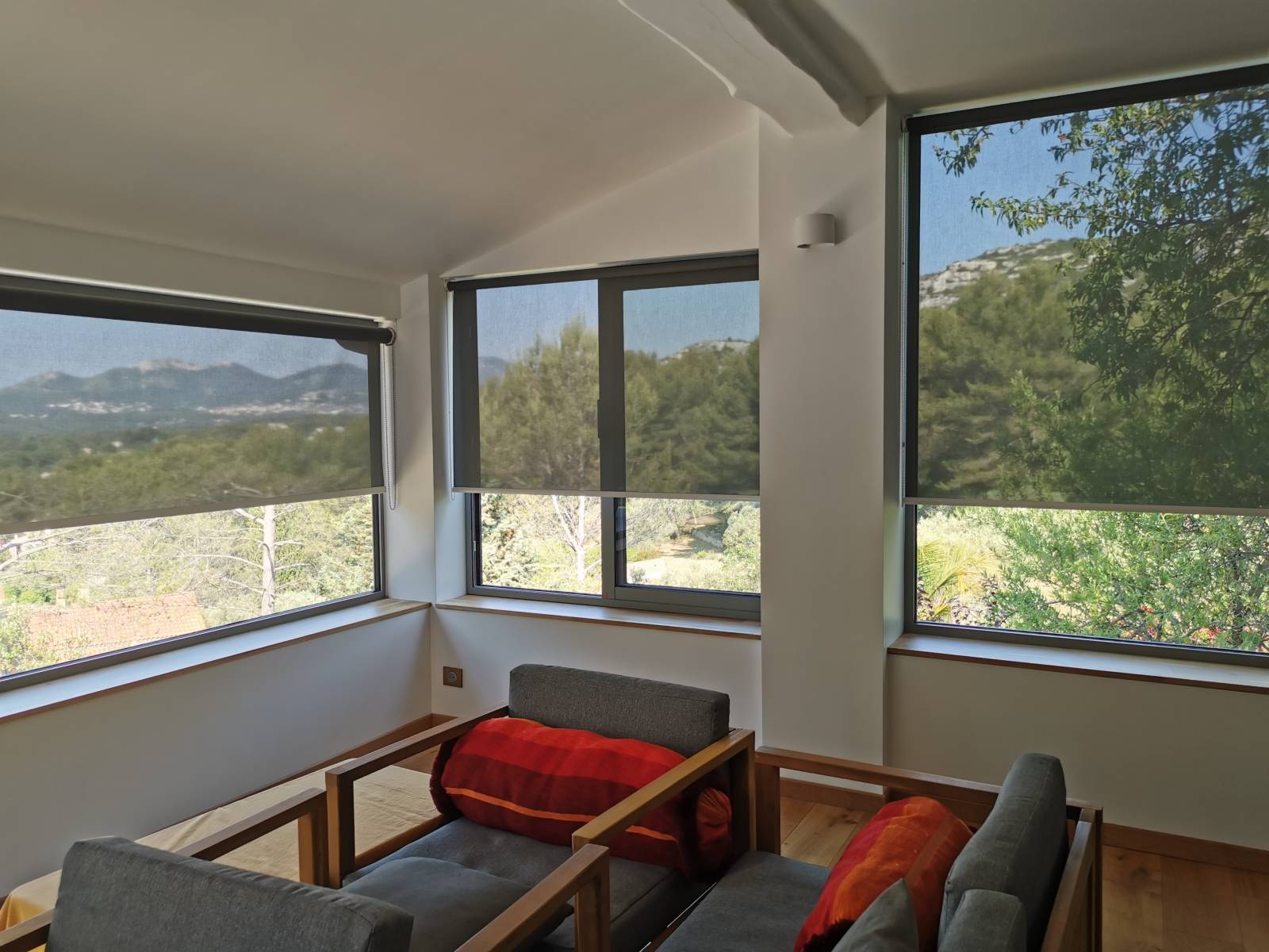 La société Alberstore à Aubagne a vendu, fourni et posé ces stores enrouleurs d'intérieur pour une véranda de la Bouilladisse. Le store rouleau EOS®500 S de maque Filtersun reste un élément sobre et design qui correspond à vos besoins. Il sait s’intégrer partout dans la maison (dans la pièce à vivre, cuisine...) et protège contre la chaleur et l’éblouissement. Sa qualité de fonctionnement est incomparable ainsi que sa manipulation ultra facile grâce à sa chaînette metallique. Notre client a opté pour un tissus type Screen qui facilite la circulation de l'air entre la vitre et le store et protège ainsi sa véranda de la chaleur. La microperforation de la toile permet également à notre client de voir vers l'extérieur et de profiter de sa vue exceptionnelle sur la colline. Les stores enrouleurs de marque Filtersun offrent une technologie haut de gamme dans le développement d’options comme la barre de charge décorative, les supports design bicolores, la chaînette métallique ou le guidage.